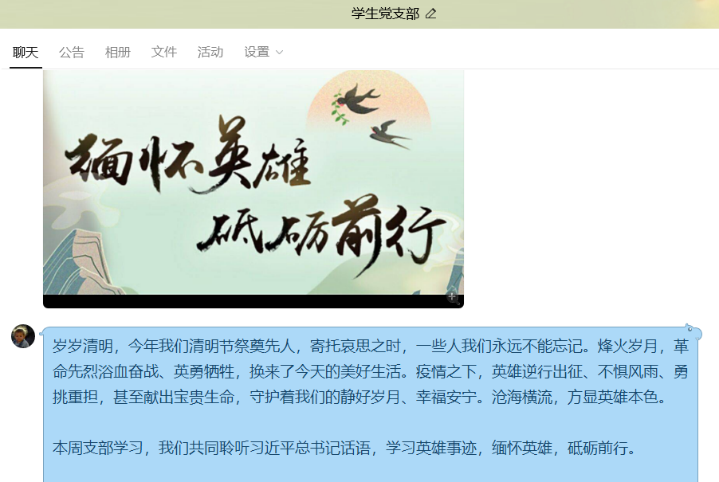 学生党支部组织支部党员共同聆听习近平总书记话语,学习防疫期间涌现的英雄事迹,缅怀英雄,砥砺前行。党员们认为当疫情形势持续向好,当武汉终于迎来“重启”,熬过这段艰难时光的我们,更要记住这些为国为民付出生命的人。支部党员结合给全系34个班级的主题班会课,指导学生开展“网上祭英烈,防疫思英雄”系列活动。