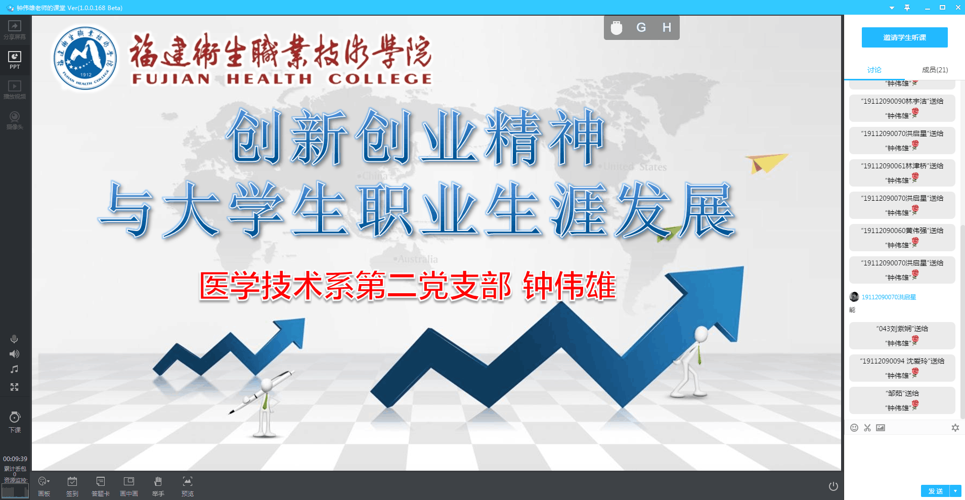 训练营第三招:群直播,空中微课心连心。3月26日晚,借助腾讯课堂直播平台,钟伟雄老师给19级创新创业小组的同学们带来一场题为《创新创业精神与大学生职业生涯发展》的直播培训讲座。同学的创新创业热情被点燃。