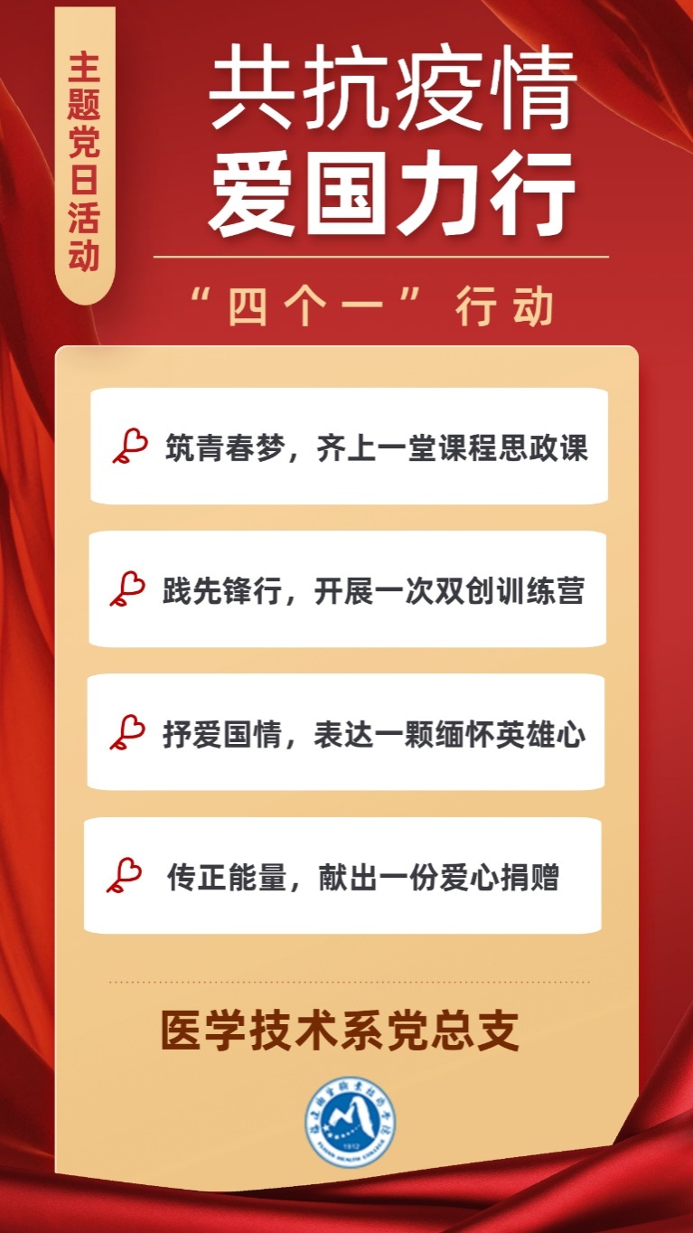 为深入学习贯彻习近平总书记重要指示精神,坚决贯彻党中央关于新冠肺炎疫情防控各项决策部署,进一步激发医学技术系党员教师的家国情怀与责任担当,医学技术系各党支部合力进行“四个一行动”,在3月份开展以“共抗疫情,爱国力行”为主题的党日活动。