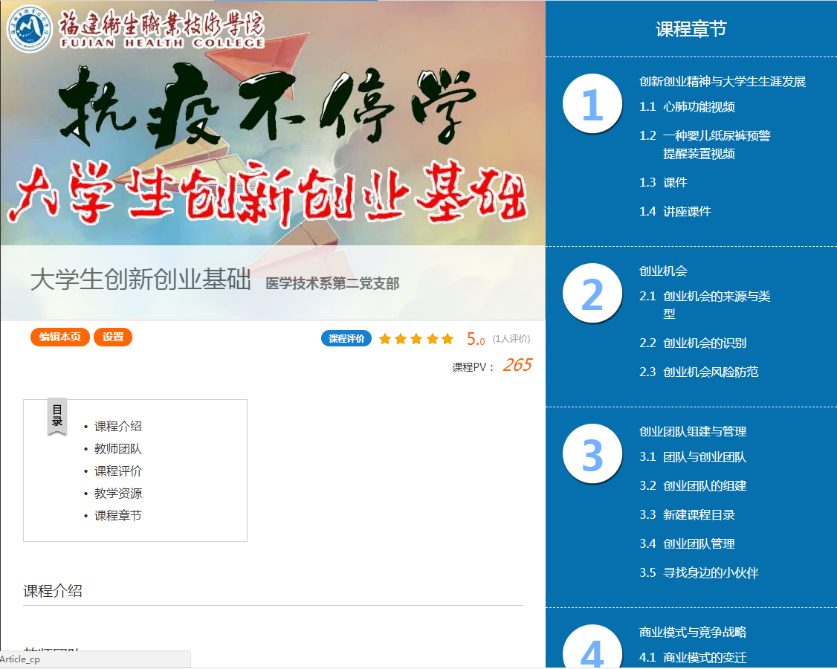 训练营第二招:建网课,双创知识学起来。医学技术系第二党支部在超星学习通平台开设《大学生创新创业基础》在线课程,共上线16学时课程,内容涵盖创新创业精神、创业机会、创业团队组建于管理、创业计划书的书写技巧等,有助于引导学生增加创新创业基础知识储备。共有33位同学作为参赛梯队队员,参与了首批次的网络学习。