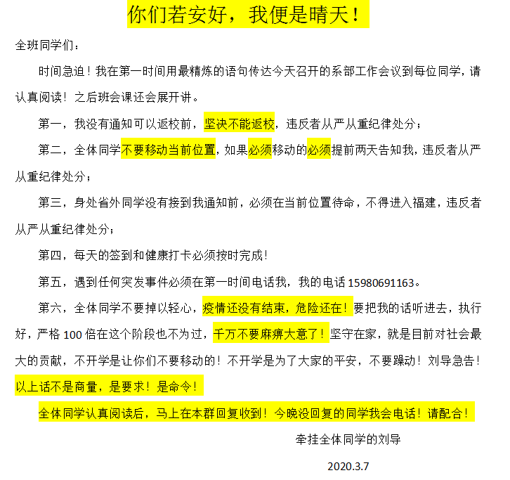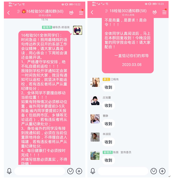 会后,各教研室主任及全体辅导员分别利用QQ、微信等网络平台,向全系1500余名师生传达了会议精神。师生们围绕会议内容积极分享心得体会。辅导员陈念文老师指出:“面对突如其来的新型冠状病毒感染的肺炎疫情,作为辅导员和学生工作一线管理员,“抗疫”时刻,虽不能成为“最美逆行者”,也要用自己扎实细致地工作,做好学生安全的“守门人”!”学生代表17检验304班谢温洁同学表示:“作为医学生,应当向在一线奋战的医护人员学习无私奉献的精神,提高防疫知识、专业知识水平。同时保护好自己,注意个人卫生,减少出行次数,提醒家人减少不必要的聚会,绝不提前返校返岗,不为国家添乱!”