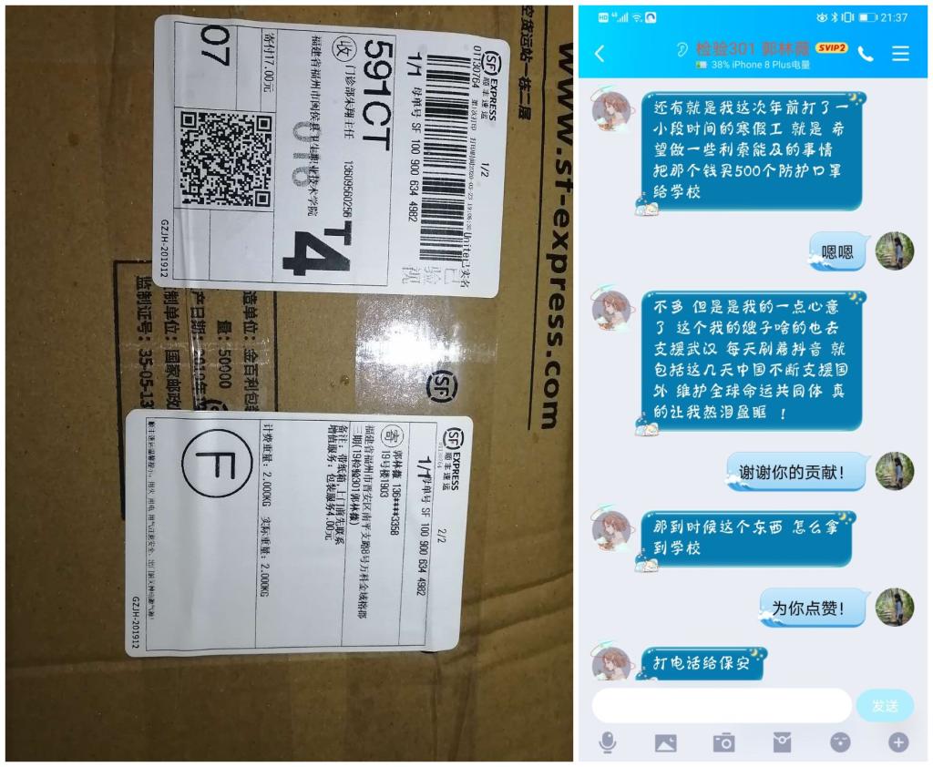 2020年3月24日,福建卫生职业技术学院收到了一个快递,里面有500个医用口罩,而寄出这个包裹的正是19检验301班的郭林薇同学。郭同学把她生平第一次打工赚的钱全买了口罩寄给母校,希望能为学校防控新冠肺炎疫情尽点绵薄之力。