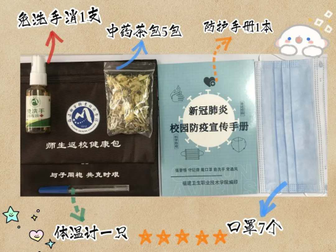 还有,老师们为同学们准备的可不仅仅只是干净整洁的宿舍哦!为保障返校后安全,你们可爱的辅导员们还利用休息时间,亲力亲为,用心的为每个同学准备健康包。为了不遗漏健康包的物品,他们采用流水线作业,有的装口罩,有的装洗手液、体温计、药茶包,有条不紊,一丝不苟。每个健康包里面有:免洗消毒液一支、中药茶包五包、体温计一支、防护手册一本、口罩七个。虽然东西不多,但是包含了学校和老师对同学们满满的爱。