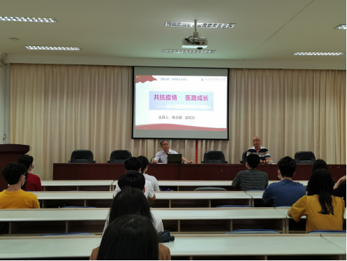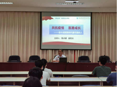 为了教育学生涵养爱国主义情怀,帮助学生掌握疫情防控知识、增强疫情防控意识、提高疫情防控能力,引导学生关注自身心理健康、保持昂扬的精神面貌,坚定战胜疫情的信心。2020年7月2日,陈贞健副院长以《共抗疫情 ,医路成长——奋斗成就新时代最可爱的人》为题,采用“线上+线下”相结合的形式为医学技术系返校复学学生讲授思政战“疫”第一课。医学技术系邱滚忠副书记主持本次授课活动。