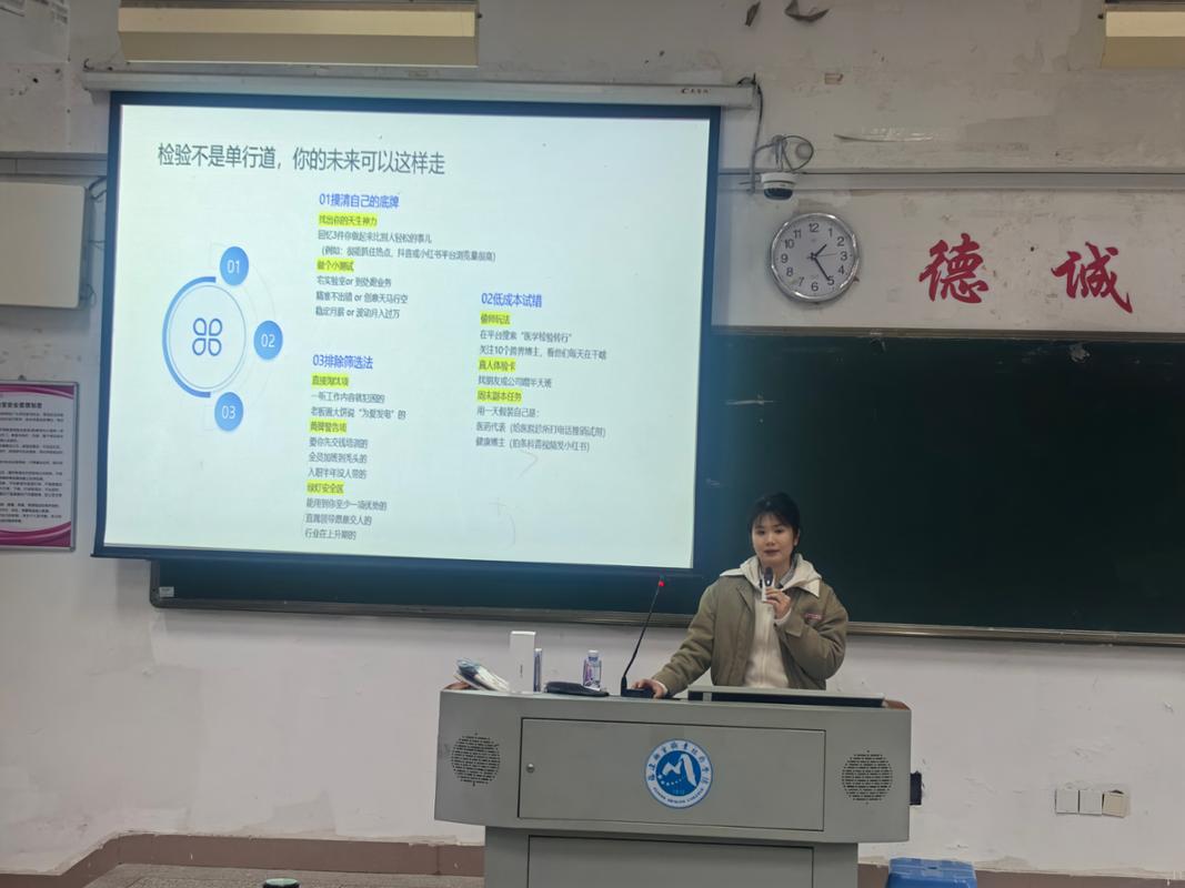 张颖慧以《医学检验与跨界探索:突破边界,启迪未来》为主题,分享了自己从医学检验到旅游业,再跨行到智能终端行业的经历,劝诫学弟学妹们就业要趁早,当不知如何抉择的时候就去行动、去尝试,只有实践才是了解自己和行业最好的办法。她结合自己经历的三个行业经验,分析了不同行业和岗位的优劣势,引导学弟学妹们要转变思维,开阔视野,如果想继续在检验专业发光发热,那不仅要着眼于传统的实验室检测,更要向行业上游、下游延伸。张颖慧建议同学们打破专业、行业和圈层壁垒,关注跨领域机会,坚持提升可迁移技能,无论在什么行业都要坚持终身学习,把握住一切成长的机会。