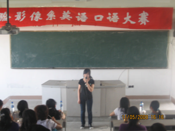 为响应学院艺术节号召,检验影像系于2009年5月12日下午在系部第2阶梯教室举行英语口语演讲比赛。担任此次比赛的评委是英语教研组的曹周英老师、张东方老师、李园源老师等九位老师。