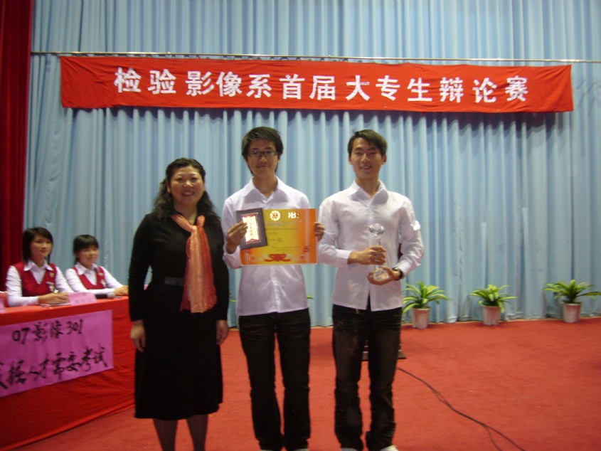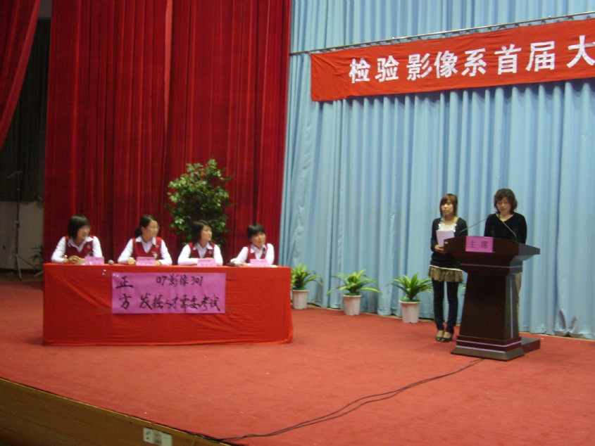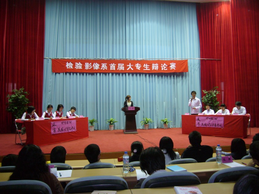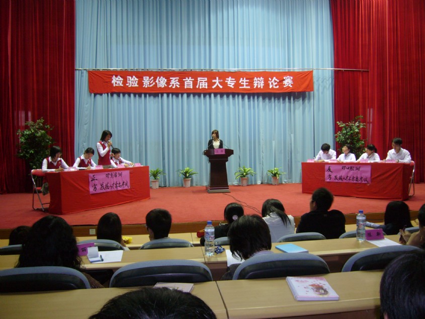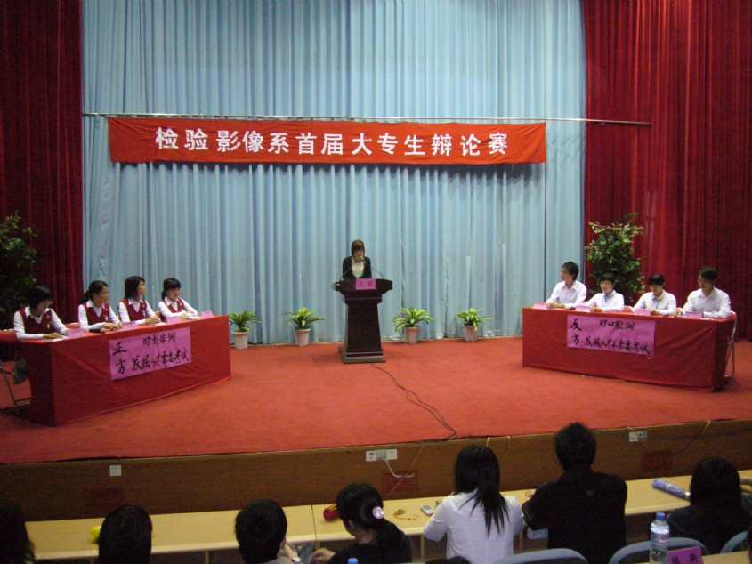 检验影像系于4月17日下午4:00在院学术厅举行“检验影像系首届大专生辩论赛”决赛。担任此次比赛的评委是:学院副书记魏立娜老师、公共基础部主任陈新老师、护理系书记谢涛老师、图书馆馆长郑向红老师、高教研究室朱扶蓉老师、公共基础部黄秋莲老师和图书馆伍丽萍老师。到场的嘉宾有学工处处长郑力宏老师、院团委书记邱滚忠老师。 对决的双方是07影像301班(正方)和07口腔301班(反方),正方的辩题是“发掘人才需要考试”,反方的辩题是“发掘人才不需要考试”,辩论赛分为立论、自由辩论,总结陈词、观众提问等环节。正反辩手们逻辑严谨,反应敏捷,妙语如珠,针锋相对,尽己所长,展示了当代大学生的风采。最后,黄秋莲老师对辩论赛进行精辟的点评。 07口腔301班凭借整体实力和扎实的理论功底赢得了这场辩论赛,勇夺桂冠,07影像301班屈居亚军;07口腔301班一辩林宇同学获得总决赛最佳辩手的荣誉称号。最后由魏立娜副书记为冠军代表队和最佳辩手颁奖,至此,检验影像系首届大专生辩论赛精彩谢幕。 此次辩论赛由检验影像系学生会主办,各班积极组建辩论队,为辩论赛进行了长期的备战,相继参加了从3月18日至4月17日近一个月时间里举行的4场初赛、2场半决赛以及决赛,在同学中掀起一股辩论旋风。辩论赛不仅锻炼了学生的思维、辩论的能力,而且将作为具有我系特色的素质教育长期开展,同时也为我院迎接人才水平评估营造了良好的氛围。