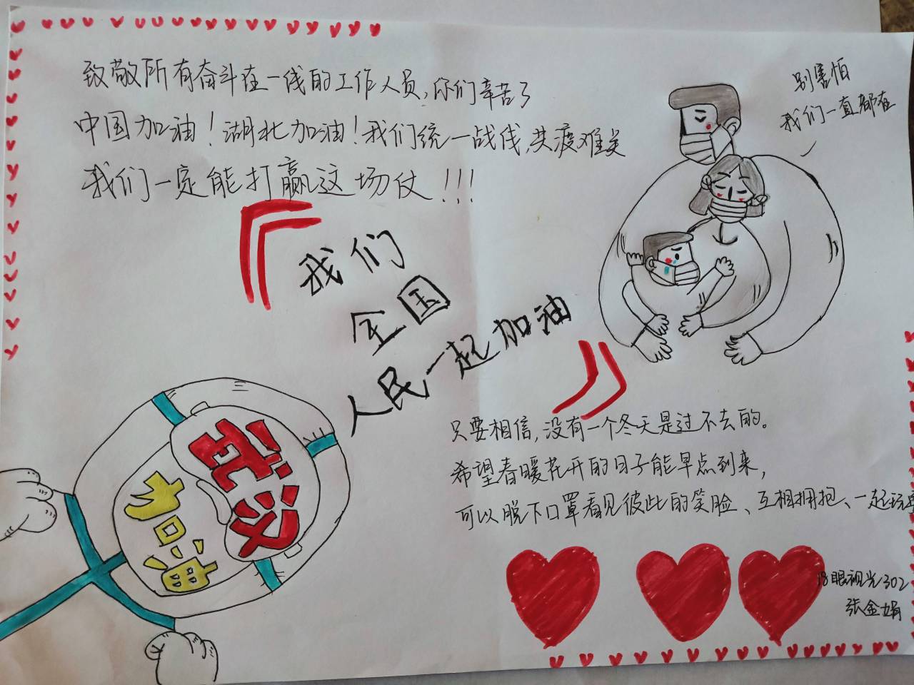 抗击疫情,我们从未松懈,在这危急时刻,尽管我们身处各地,但是,我们依旧与武汉同胞们风雨同行,安危与共!在一张张雪白的纸上写下自己对一线医务工作者的关心和对于战胜疫情的信心,希望能早日战胜疫情,期盼着奋斗在一线的英雄们能早日平安归来,与我们同行。