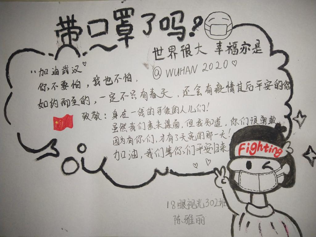 武汉病情依旧肆虐,在这全民抗击疫情的时刻,我们闽卫学子万众一心!“阳光总在风雨后”“中国加油!武汉加油!”一句句话语包含着对武汉疫情早日攻克的期望。