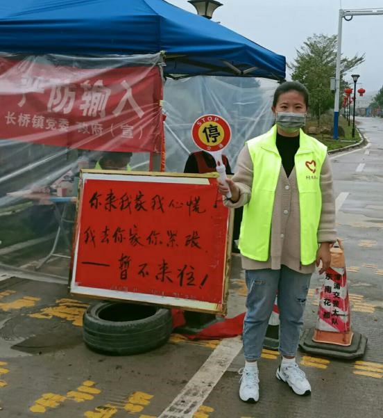 18眼视光302班陈抒静同学是福建省漳州市南靖县丰田镇丰田社区抗击疫情一线志愿者,职责是与社区工作人员一起劝返外县人员来访查验车辆进出通行证,引导宣传抗击疫情相关知识政策,测量体温和提醒佩戴口罩。她说:“查验工作很顺利,大部分人都非常理解和支持我们志愿者的工作,身处在抗疫防疫第一线时,深刻地感受到这场突如其来的疫情对人们的考验。身为一名志愿者,我会为抗击疫情出一份力,用行动抗击疫情。”