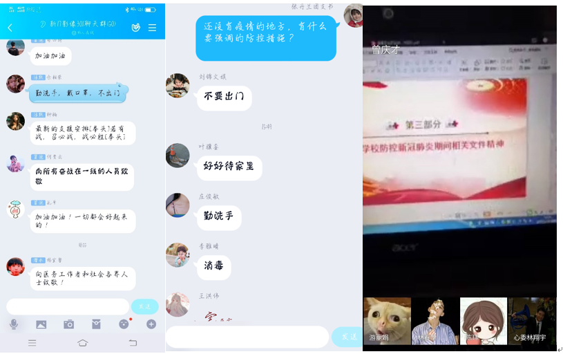辅导员龙梅梅老师在团日活动中针对疫情做了分析,提醒同学们在家学习,减少外出,提高警惕,保护好自己的安全。同学们手写祝福语,用优美的文字表达对祖国对武汉的祝福!罗沁琳同学说:“这次团日虽然和之前的开展方式有所不同,但是意义非凡。辅导员在班会上为我们科普了新型冠状病毒和防范它的知识以及现在的疫情情况,还关注我们的学习情况,鼓励大家在疫情期间也要努力学习。我们也用手写字,表达了对武汉同胞们的祝福,相信只要我们坚定信心就一定能够打赢这场防疫攻坚战!”