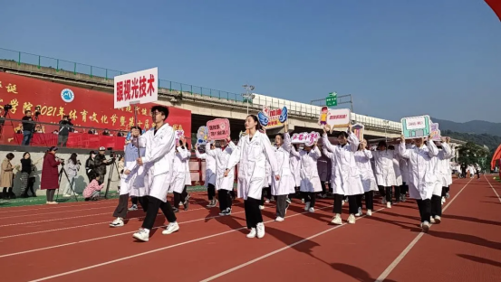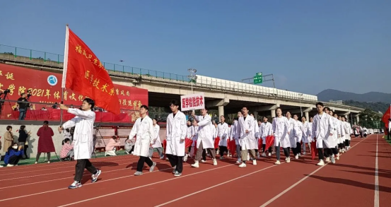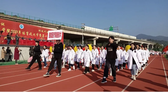 伴随着运动员进行曲,各专业代表队逐一入场检阅。医学技术系四个专业方阵以昂扬的精神面貌、嘹亮的口号、整齐的步伐亮相在全体同学面前。