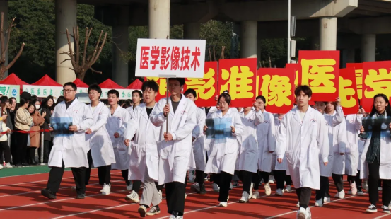 随后出场的是影像专业方阵,影像学子们带着“精准医学,影像先行,精准影像,技术先行”的口号向我们徐徐走来,他们手持极具有专业代表性的X光片,向我们展示了影像专业的魅力与热情。