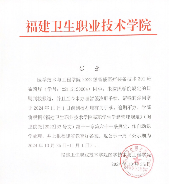 关于22医疗装备301喻莉烨自动退学的公示