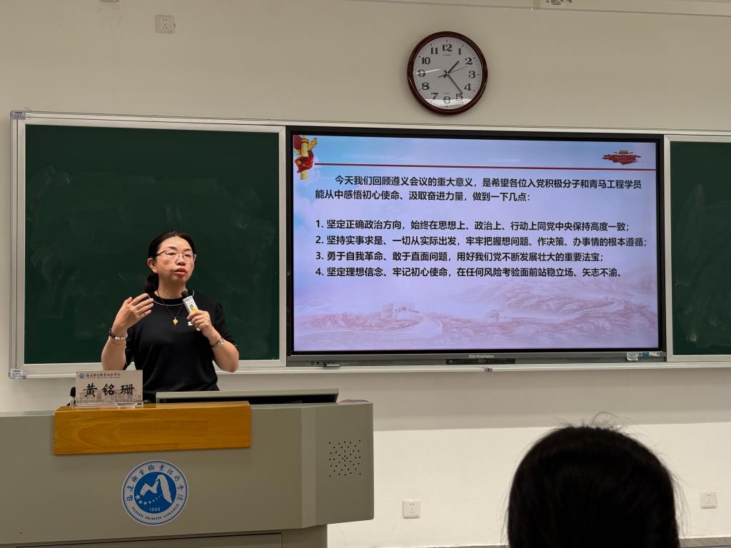 党课上,黄铭珊围绕遵义会议的背景、参会人员、经过及意义,带领学员重温光辉历史,剖析其作为党历史上生死攸关转折点的重大价值,并提炼四点启示:一是坚定正确政治方向,始终同党中央保持高度一致;二是坚持实事求是,把握想问题、作决策、办事情的根本遵循;三是勇于自我革命,用好党发展壮大的重要法宝;四是坚定理想信念,在风险考验面前站稳立场。