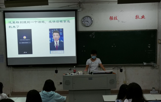 最后,董细敏还呼吁,尽管我国粮食生产连年丰收,但我们老百姓对粮食安全还是始终要有危机意识,今年全球新冠肺炎疫情所带来的影响,更是给我们敲响了警钟。她号召在座同学作为当代大学生,应学会在节约粮食的前提下进行健康的饮食,让节约粮食、健康饮食的观念深入人心!