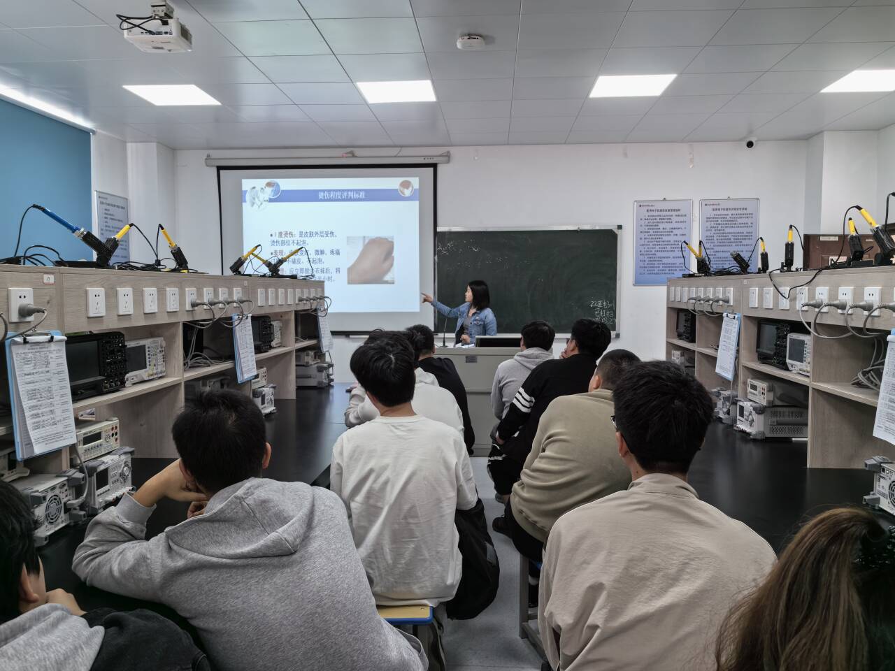 为保证演练活动安全、有序进行,我院事先进行周密安排,制定演练方案。本次演练分两个部分进行。第一部分,烫伤应急处理演练。首先我院宋春歌老师集中讲授实训过程中烫伤的临床表现、处理流程及预防措施。告知学生发生烫伤不要惊慌,听从指挥,完成应急处理流程。工作人员维持现场秩序,确保实训室无发生其他安全事件。
