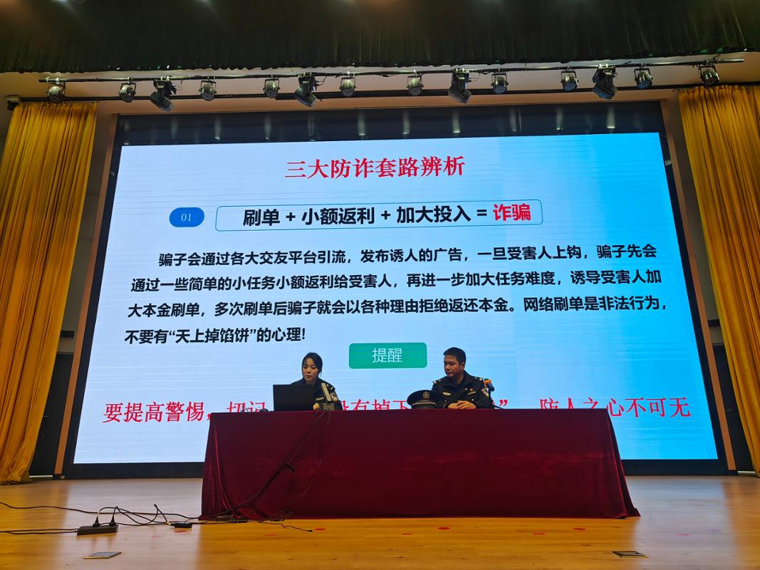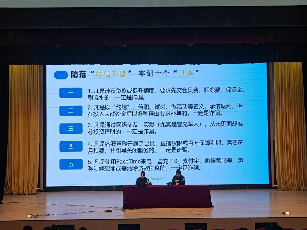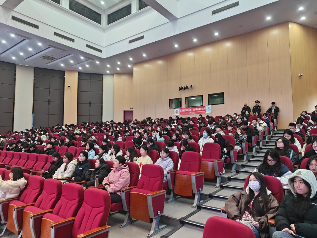 新学期,为有效提高我校学生防范电信网络诈骗意识和能力,识别目前较为常见的各类电信网络诈骗的手段和方法,2025年2月21日,闽侯县公安局荆溪派出所副所长陈耀带队,我校校外法治辅导员郑腾强警官等一行为我校学生作题为《加强自我防范意识 谨防网络诈骗》的安全知识讲座,刑侦大队反诈中心警官吴诗吟主讲,医学技术与工程学院学生及部分护理学院学生参加讲座。