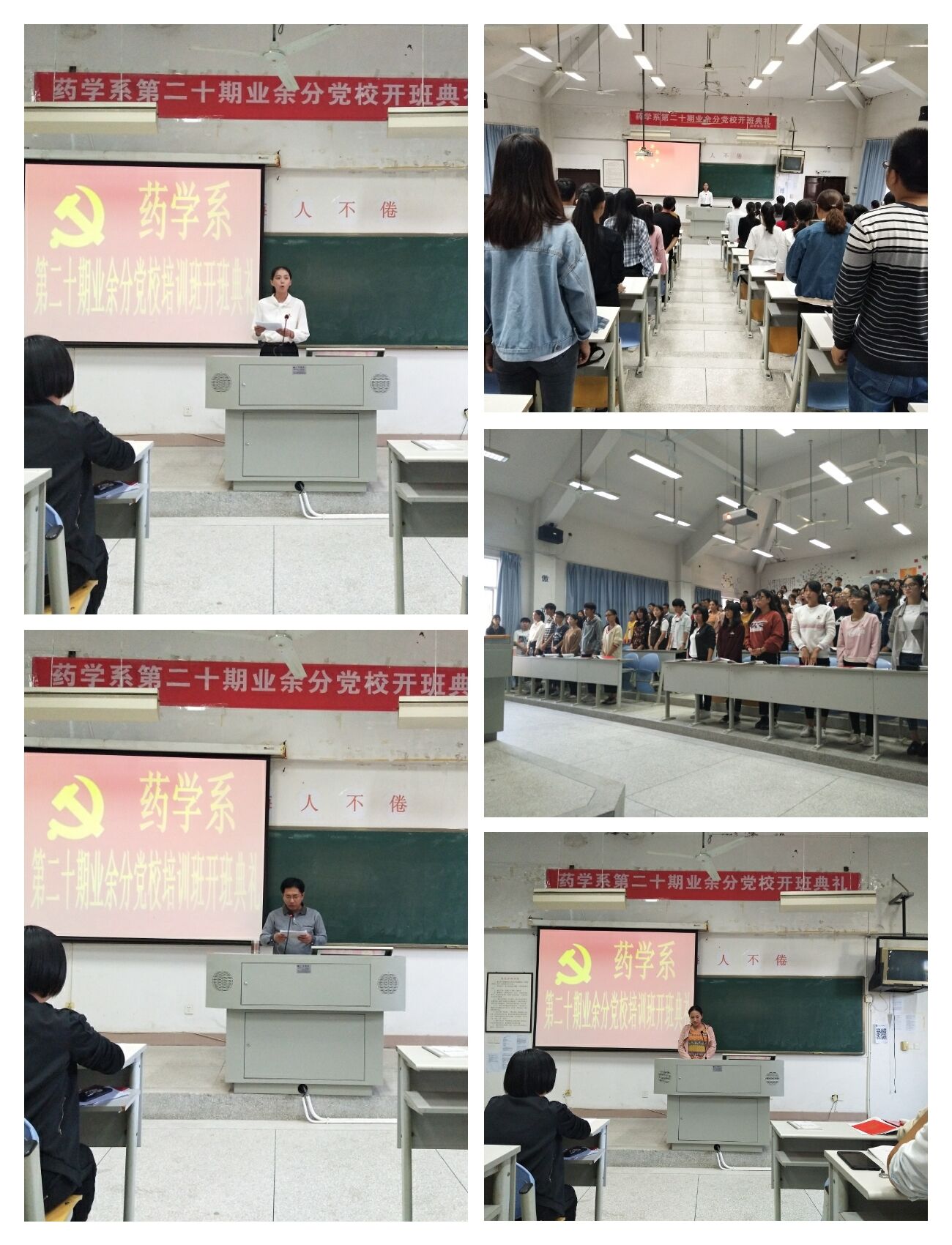 2017年11月2日,药学系在药二阶隆重召开第二十期业余分党校开班典礼,莅临本次大会的领导老师有:党总支陈洁副书记,党总支委员、系副主任李泳宁博士,党总支委员叶雅沁老师,第一党支部书记郭丹老师,第二党支部书记何舒澜老师,学生党支部书记苏素娇老师以及全体辅导员。