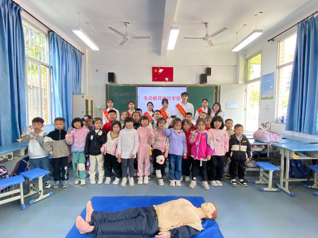 活动开始,党员们乘车前往连江县潘渡镇中心小学。学生预备党员发扬闽卫医学生特长,组织开展生命教育体验学堂活动,生动形象地给小朋友们讲解了心肺复苏、紧急救护的正确步骤及如何运用三角巾及绷带包扎伤口,并“手把手”指导同学们实操演练,让小朋友们更直观地领会、掌握急救知识技能及要领。