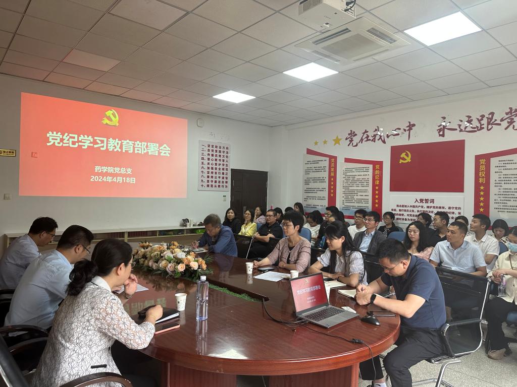 4月18日,药学院党总支组织开展党纪学习教育部署会,传达学习习近平总书记关于党纪学习教育的重要讲话和重要指示精神以及上级会议、文件精神,对学院党纪学习教育开展工作部署。药学院全体党员到场参会,会议由党总支书记林颖峰主持。