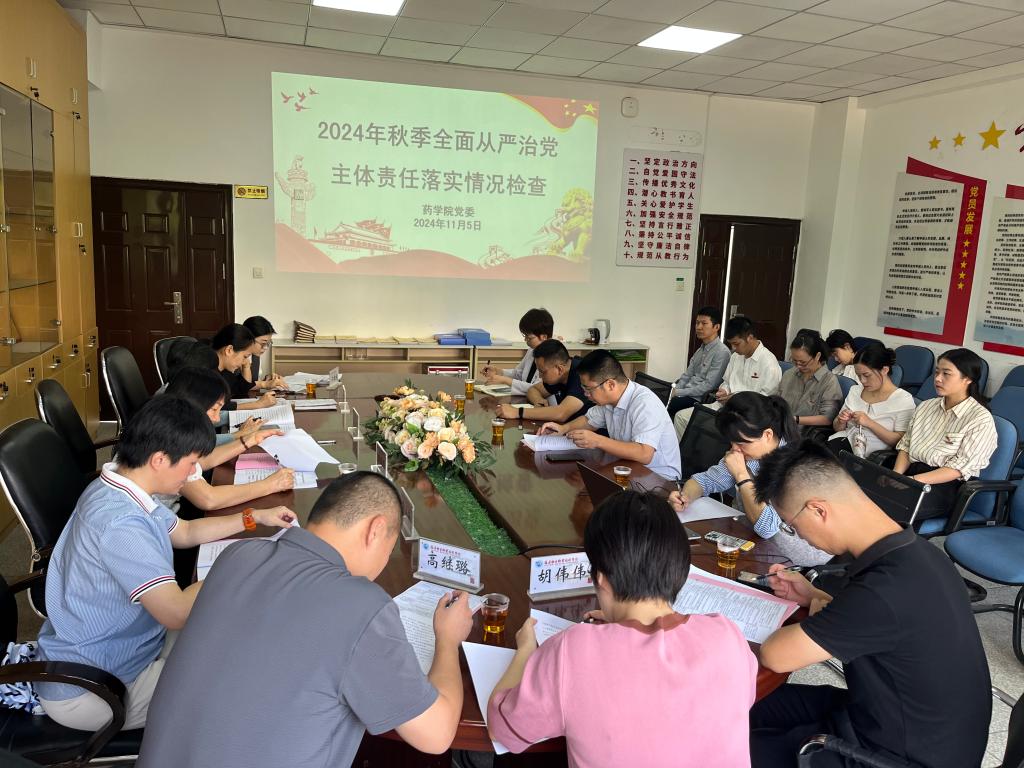 2024年11月5日,药学院党委在会议室召开2024年秋季全面从严治党主体责任落实情况检查会。校党委委员、党委副书记李美华带领第二检查组成员到会指导,药学院党委委员、各支部书记参加本次会议。