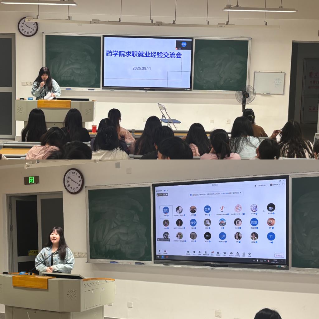 为帮助我院2025届毕业生精准把握就业形势,提升求职竞争力,搭建优秀校友与在校生的沟通桥梁,5月11日晚,药学院第三、第四党支部举办“一站式”学生社区求职就业经验交流活动。本次活动邀请到两位2024届优秀党员校友李梓茹和陈思琪为即将踏上求职之路的2025届学生分享宝贵经验,活动通过线下线上两个平台举办,气氛热烈。