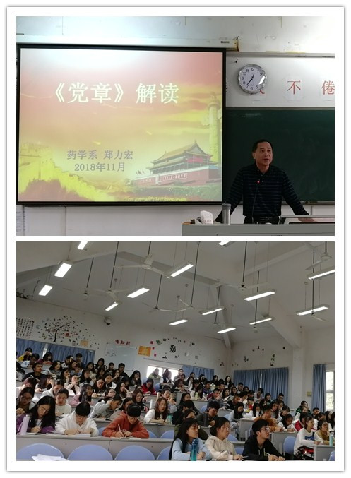 11月19日,我系第21期业余分党校在药二阶正式开课,本次党课的主题是《中国共产党章程》解读,由药学系党总支郑力宏书记主讲。100多位思想上进、积极向党组织靠拢的同学参加了本次的党课学习。