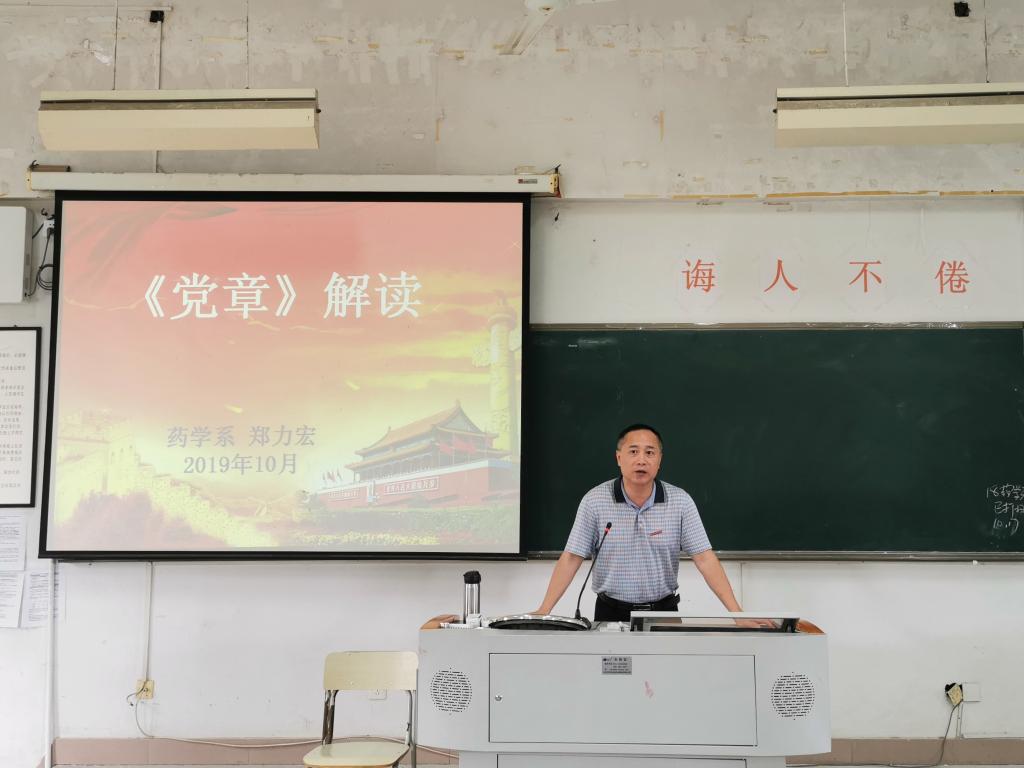 为增强入党申请人对《中国共产党章程》的了解,提高入党申请人的组织纪律及政治意识,2019年10月18日,药学系第二十二期业余分党校在药二阶正式开课,本次党课的主题为《中国共产党章程》解读,药学系党总支郑力宏书记应邀主讲。