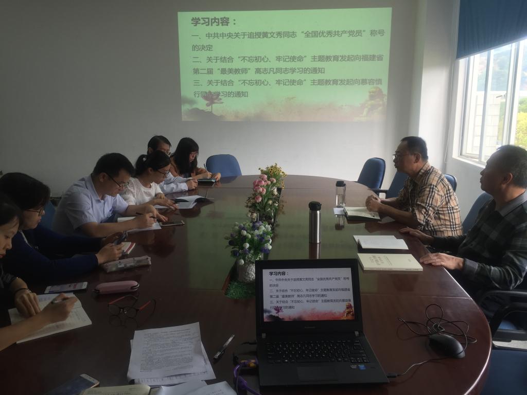 日,药学系中心组(扩大)在系部会议室集中学习《中共中央关于追授黄文秀同志“全国优秀共产党员”称号的决定》、《关于结合“不忘初心、牢记使命”主题教育发起向福建省第二届“最美教师”高志凡同志学习的通知》、《关于结合“不忘初心、牢记使命”主题教育发起向慕容慎行同志学习的通知》等内容,会议由药学系党总支郑力宏书记主持。