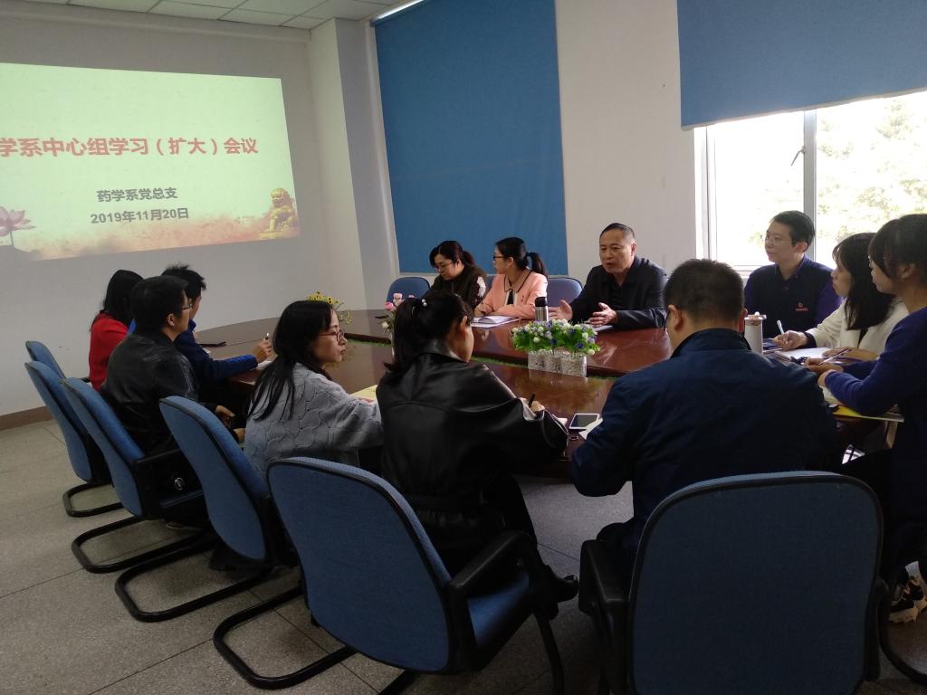 2019年11月20日,药学系中心组(扩大)于系部会议室集中学习党的十九届四中全会精神,会议由药学系党总支书记郑力宏主持。