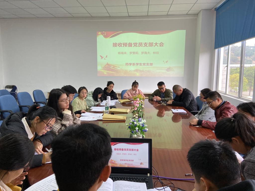2019年12月20日下午,福建卫生职业技术学院药学系学生党支部于药学系207会议室召开接收预备党员大会,讨论关于杨福来、罗雯莉、罗海太、林欣等4名同志考察期满拟转中共预备党员事宜。大会由药学系学生党支部陈翰书记主持,药学系党总支赖文金副书记及各支部党员出席大会。