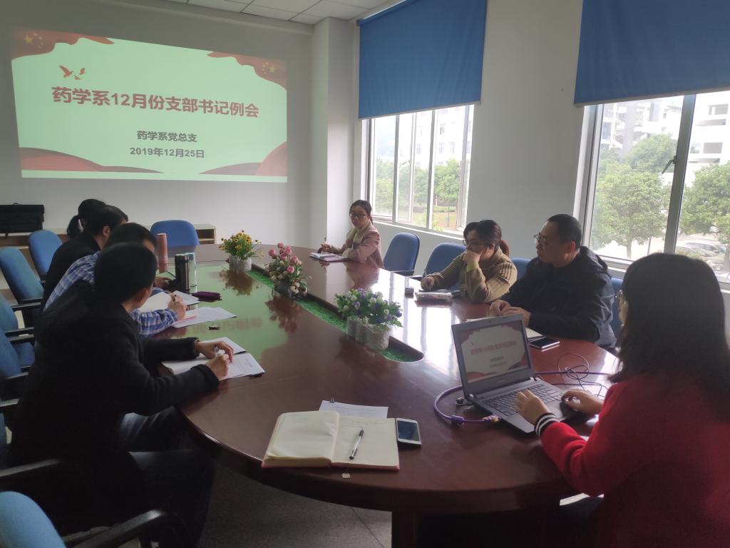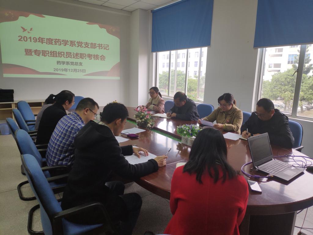 2019年12月25日,药学系党总支在系部会议室召开12月份支部书记例会暨党支部书记、专职组织员述职考核会,学院纪委书记游锋莅临现场,系党政领导班子、总支支委、支部书记出席会议,会议由党总支赖文金副书记主持。