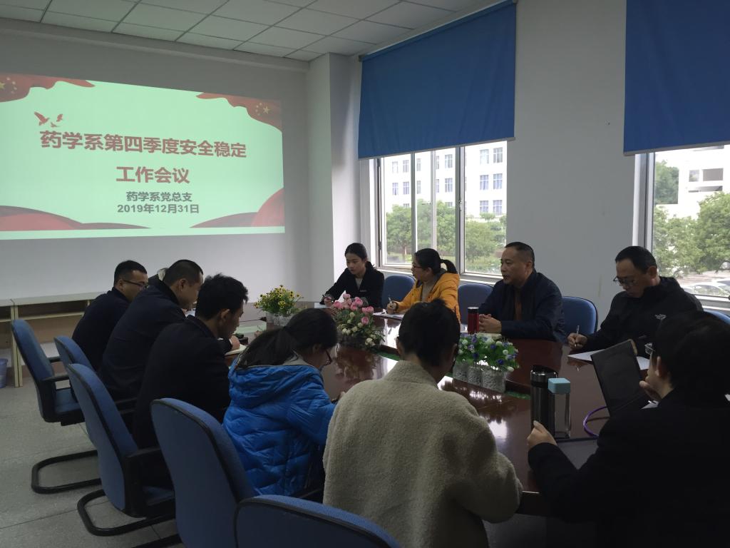 2019年12月31日,药学系党总支在系部会议室召开第四季度安全稳定工作会议,药学系党总支书记郑力宏、副主任(主持工作)肖健、党总支副书记赖文金、副主任潘雪丰、总支委员、各支部书记、教研室主任、实训中心主任及全体辅导员到场参会,会议由党总支书记郑力宏主持。