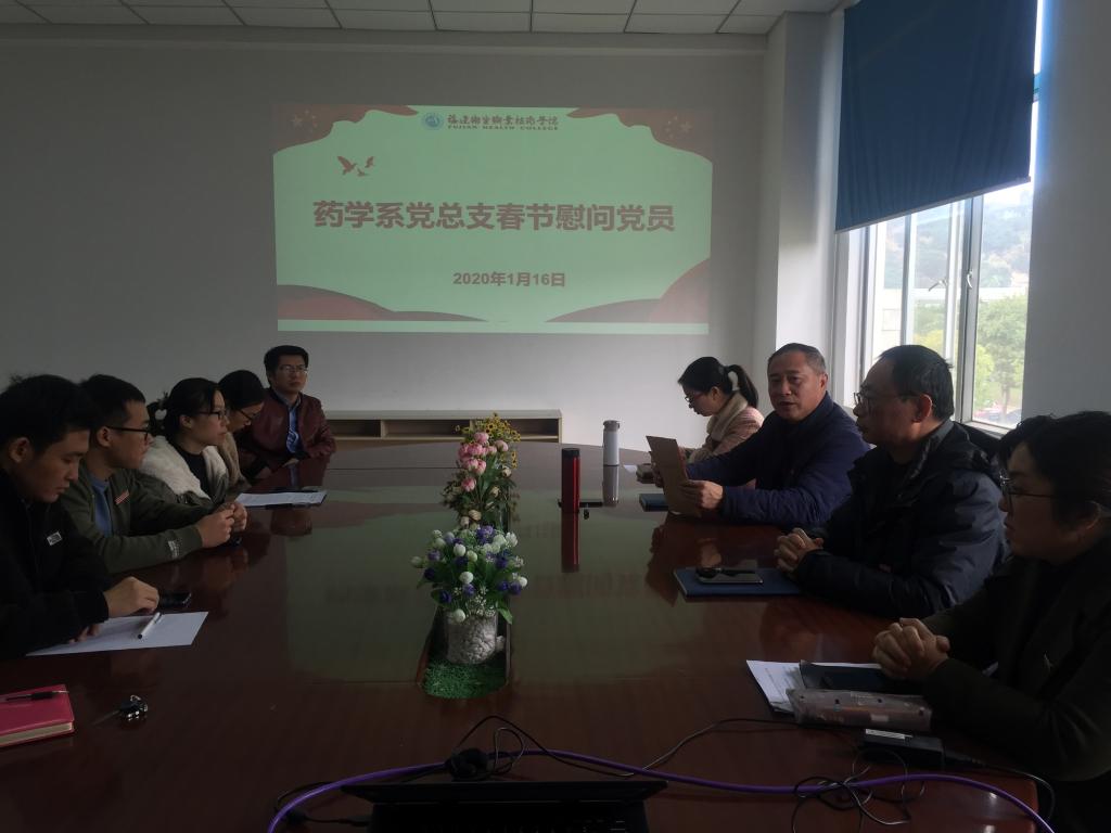 为深入学习贯彻习近平新时代中国特色社会主义思想、坚持党的群众路线、巩固“不忘初心、牢记使命”主题教育成效和贯彻落实省委十届九次全会精神的重要举措,2020年1月16日,药学系党总支在系部会议室开展春节慰问党员活动。