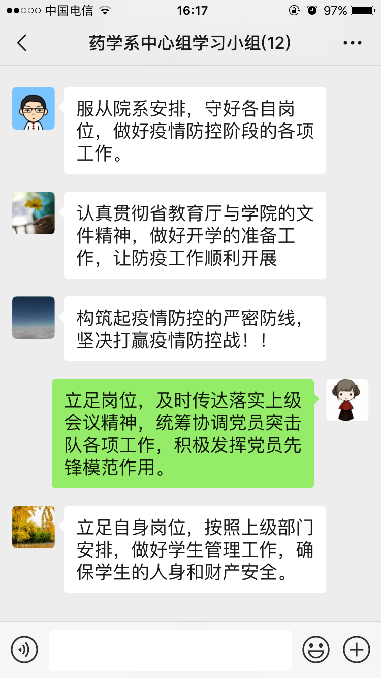 2020年2月20日,药学系党总支在微信群召开中心组学习(扩大)会议,集中学习近期省委教育工委以及学院关于疫情防控工作的相关决策部署,会议由药学系党总支书记郑力宏主持。