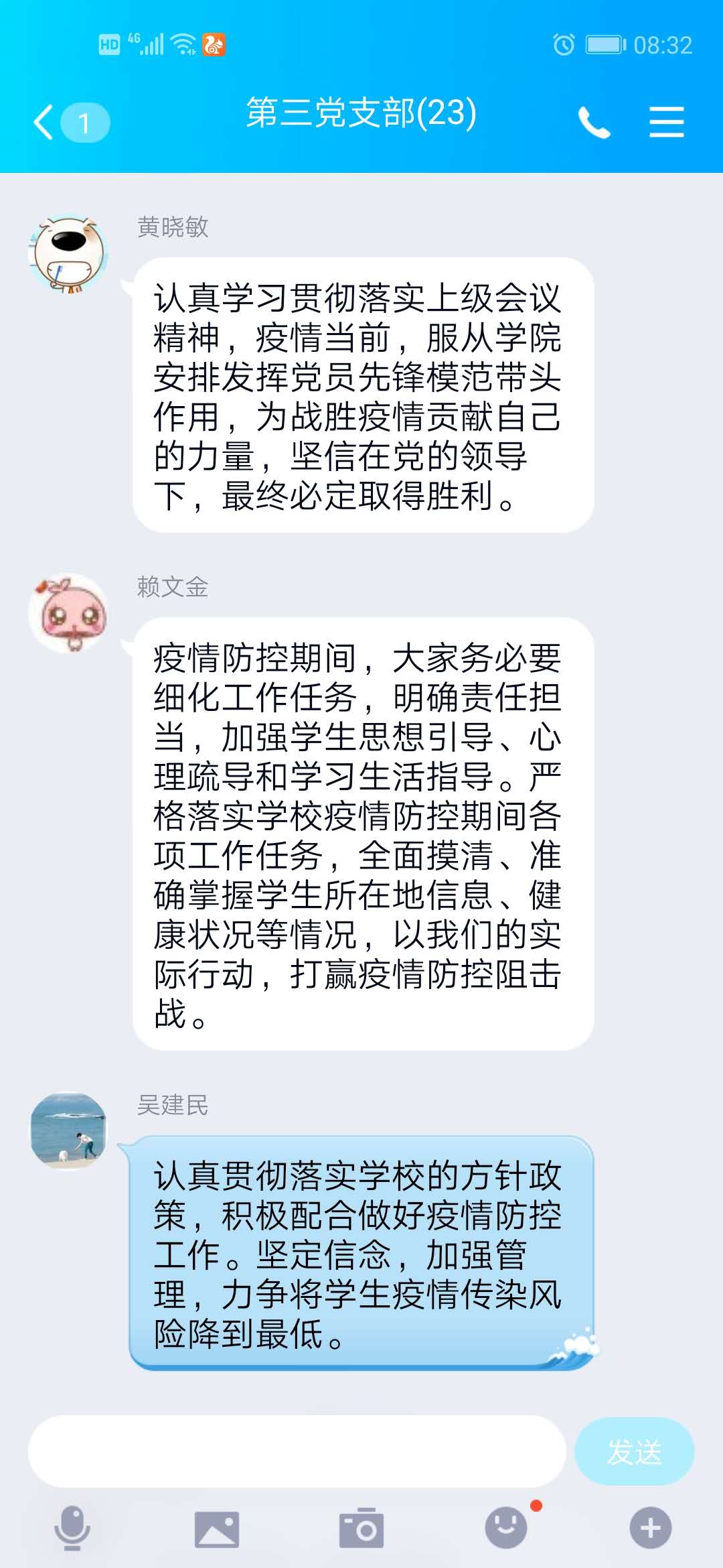 2月20日,药学系学生党支部以QQ群为载体,通过线上语音集中学习福建省教育厅《关于引导高校师生有序返校的通知》及《福建卫生职业技术学院新型冠状病毒肺炎疫情防控工作方案》等两份文件精神。