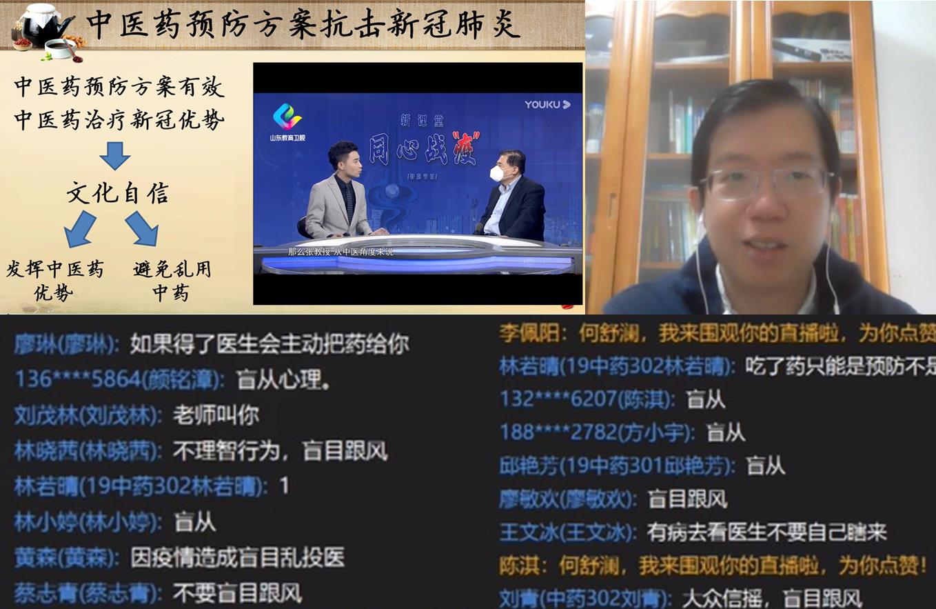 《中药学》在线课程由药学系第一党支部书记,双带头人何舒澜老师主讲,为保证在线教学的质量,党支部高度重视,从平台的选择到教学程序的安排,从课程内容的讲授到思政元素的融入,支部事先都做足了功课。在线课程从“一夜间‘双黄连’成为比口罩还紧俏的存在”说起,引发学生对防控疫情期间部分民众哄抢“双黄连”这一事件的讨论与思考,引申出中药在疫情防控中如何发挥作用的问题,教育学生既要肯定中药在防控疫情中的重要作用,树立文化自信并激发民族自豪感,又要避免陷入乱用中药的误区,坚持在中医理论指导下正确使用中药。短短十几分钟的互动,不仅围绕时政热点激发学生共鸣做到思政教育,同时也在专业层面讲清了中药的含义,全程学生积极参与,踊跃发言,取得了良好的效果。