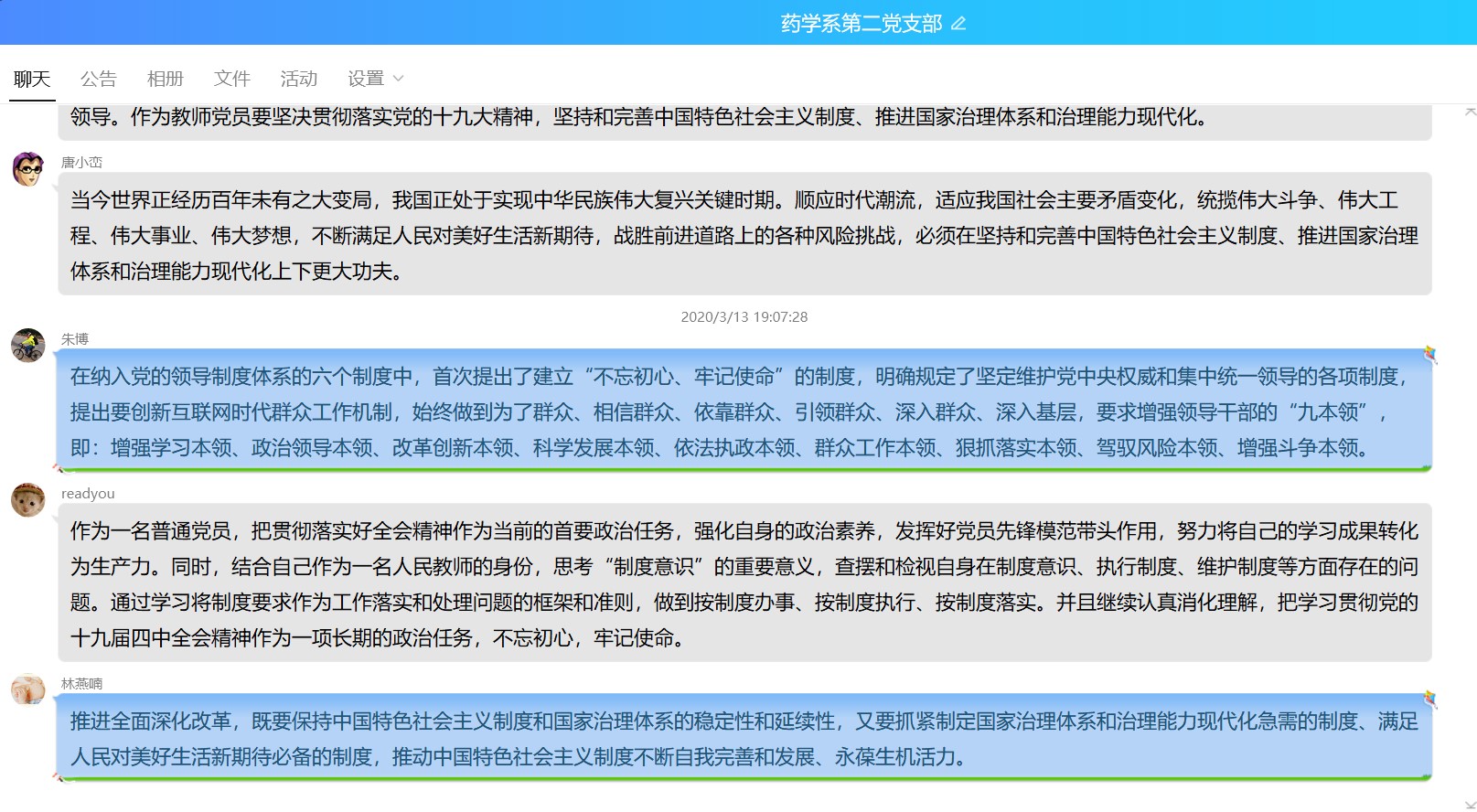 3月13日,为深入学习贯彻党的十九届四中全会精神,进一步做好疫情防控工作,药学系第二党支部通过微信群开展我学党的十九届四中全会线上主题党日活动。