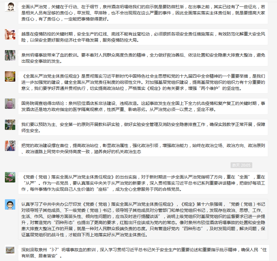 与会同志结合个人岗位实际交流心得,大家纷纷表示将深刻汲取泉州“3·7”坍塌事故血的教训,以案示警中受警醒、明法纪,不仅如此,深入学习贯彻习近平总书记关于全面从严治党重要论述,立足岗位,严格落实、积极为院系做贡献。