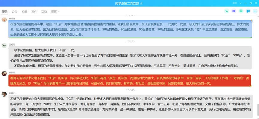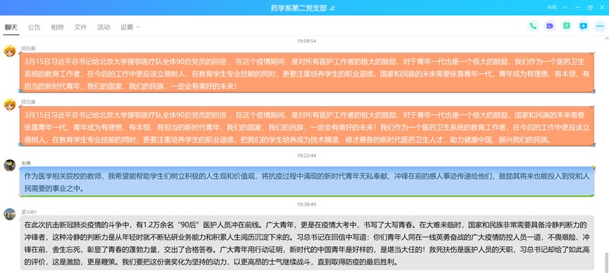 疫情防控是一场人民战争,每个党员都是一面旗帜,可以感召一群人、带动一群人,汇聚起更强大的战疫力量,在疫情防治攻坚时间,习近平总书记回信勉励北京大学援鄂医疗队全体“90后”,给优秀的青年医务工作者发出了最强音量。为深入学习贯彻落实习近平总书记的回信精神,2020年3月26日,药学系第二党支部开展“抗疫路上,共同的初心”主题党日活动,学习“习近平回信勉励北京大学援鄂医疗队全体“90后”,将疫情防控工作落实到具体的教学工作中。