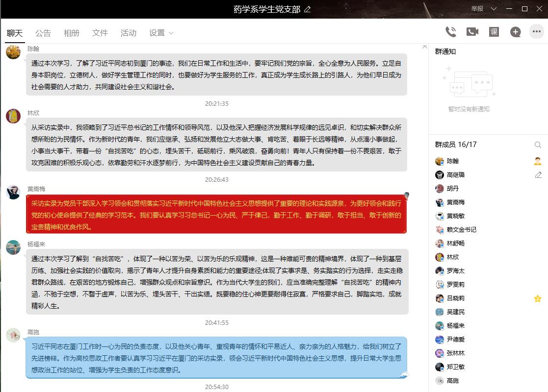 习近平总书记曾在1985年厦门市委常委组织生活会上说,“我来厦门工作,用孙中山先生‘不要立志做大官,而要立志做大事’来勉励自己,地位变了,作风不能变”。5月16日,药学系学生党支部通过QQ平台,集中学习李秀记采访录“习近平同志来厦门是要‘立志做大事’”,支部全体师生党员参与学习。