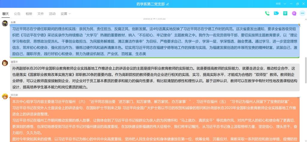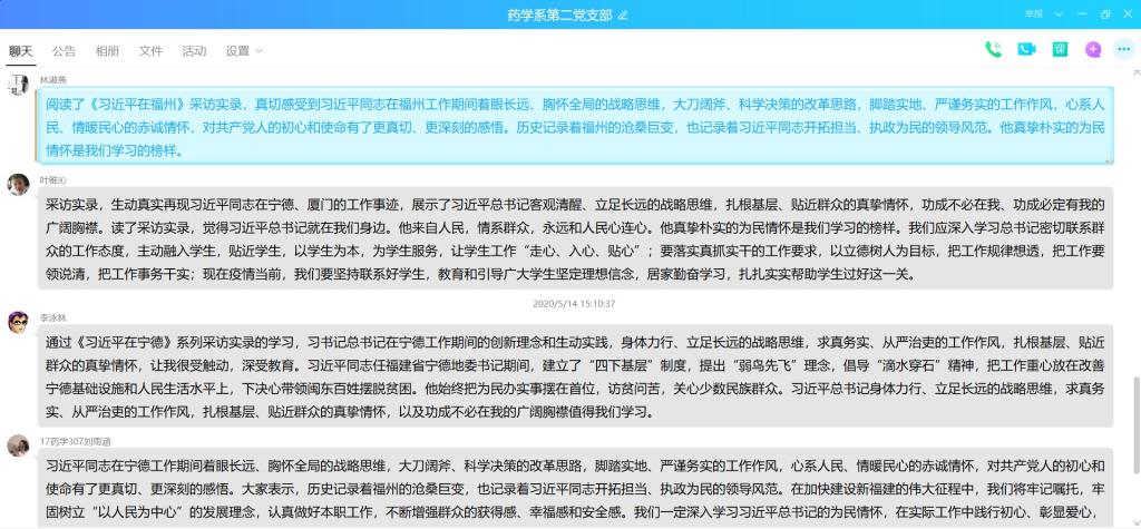 2020年5月15日,药学系第二党支部开展线上专题学习活动,全体党员集中学习《习近平在厦门》、《习近平在宁德》两部采访实录部分选篇 。本次专题学习由支部书记邓元荣同志主持。