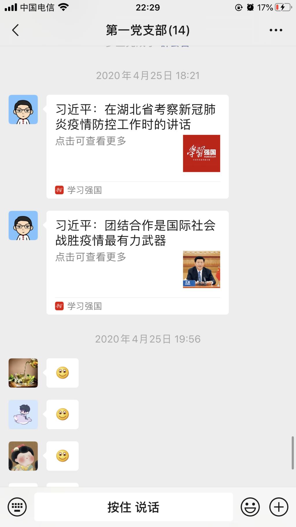 4月25日,药学系第一党支部通过微信平台,集中学习“习近平在湖北省考察新冠肺炎疫情防控工作时的讲话”、“习近平:团结合作是国际社会战胜疫情最有力武器”等内容,活动由支部书记何舒澜主持。