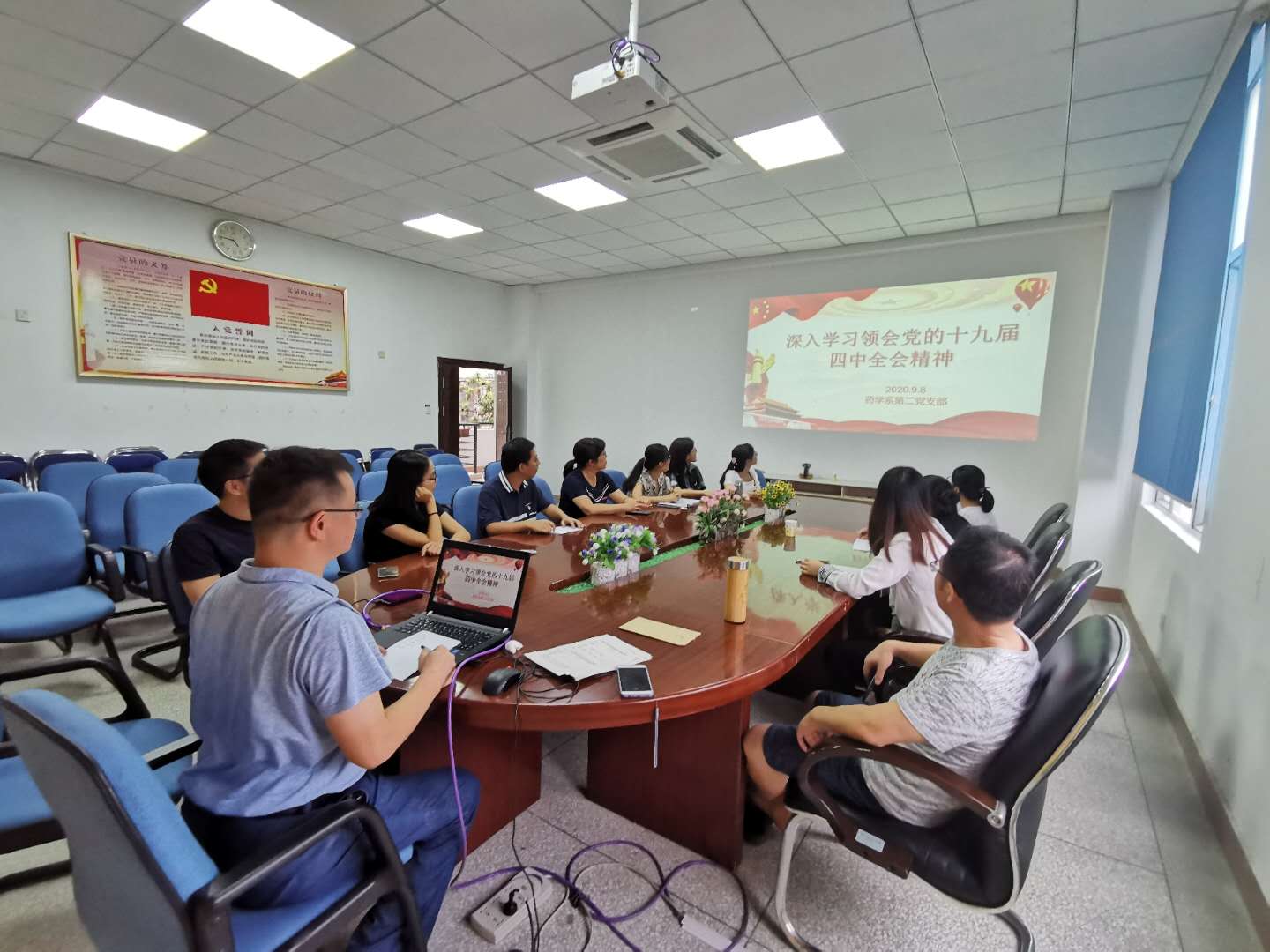 2020年9月8日,药学系第二党支部开展深入学习党的十九届四中全会精神专题党课。本次党课由党支部书记邓元荣同志主讲,支部全体成员参加学习并围绕学习主题发表感言。