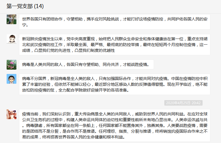 4月25日,药学系第一党支部通过微信在线学习习近平关于新冠疫情防控作出的重要讲话,即“习近平:在湖北省考察新冠肺炎疫情防控工作时的重要讲话”、“习近平:团结合作是国际社会战胜疫情最有力武器”,活动由支部书记何舒澜主持。