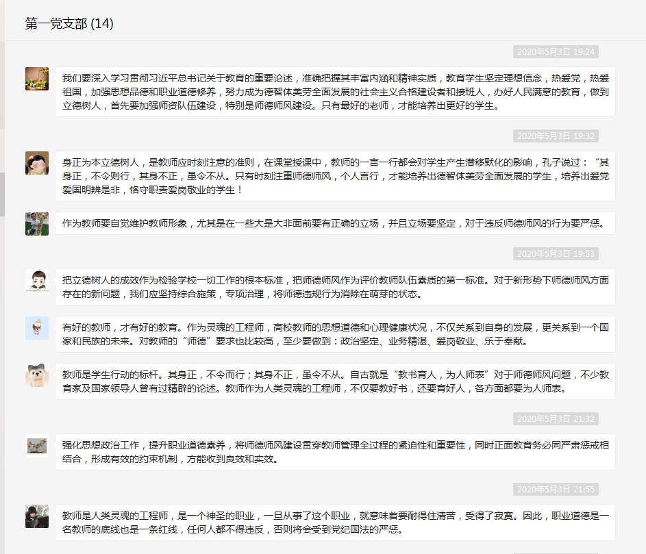 2020年5月3日,药学系第一党支部通过微信群在线开展师德师风建设学习活动,本次支部活动恰逢五一小长假,党员同志在休息的同时不忘学习,认真研读了《加强师德建设当坚持失责必问》、《教育部强调师德师风第一标准:严重违规者将终身禁教》两篇文章。活动由支部书记何舒澜主持。