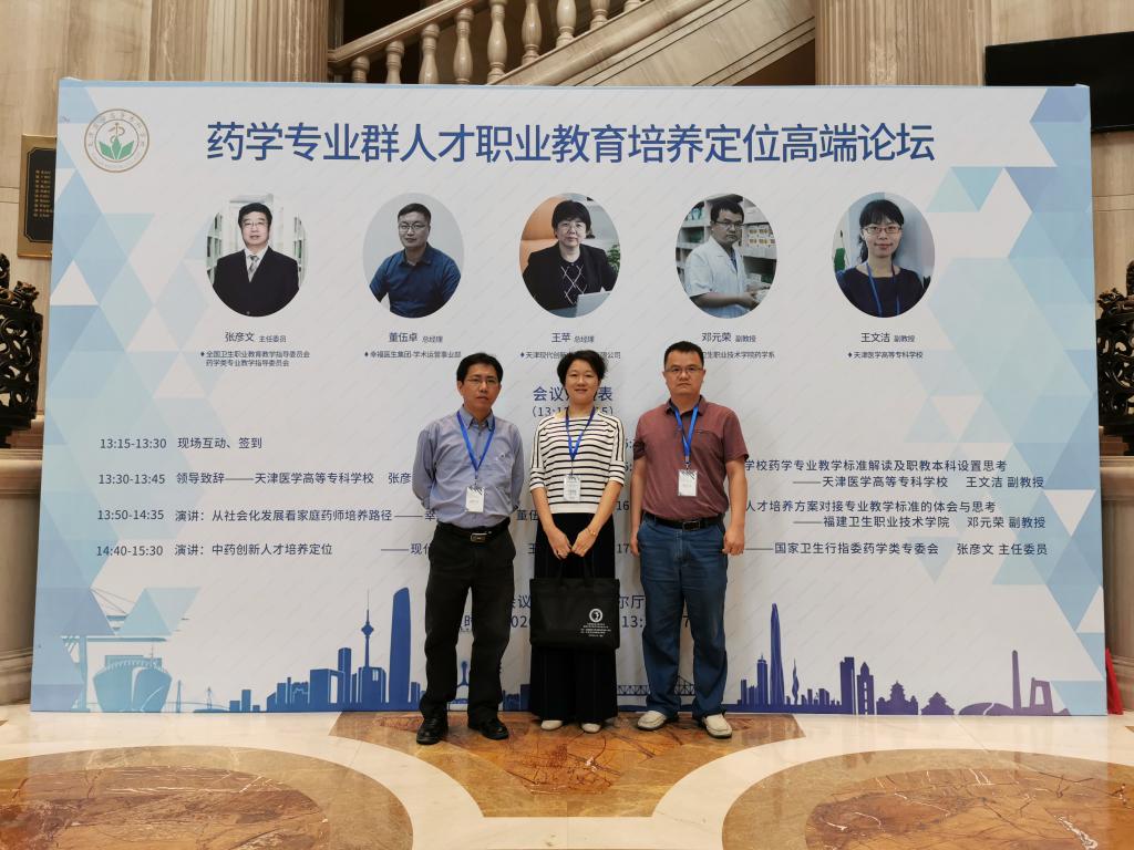 2020年9月13日,药学系第二党支部书记、支部“双带头人”、药理教研室主任邓元荣在学院教务处处长朱扶蓉带队下与药学系副主任李泳宁一同赴津参加由天津医学高等专科学校药学专业群人才培养定位论坛,本次论坛在“双高计划”背景下,为贯彻落实《国家职业教育改革实施方案》要求,进一步完善职业教育国家教学标准体系,加快推进卫生职业教育改革与发展,奋力办好新时代卫生职业教育,实施专业建设“五新”和“五个对接”,即有新定位、新名称、新内涵、新结构、新体系,对接时代发展,对接数字经济,对接科技进步,对接市场需求,对接新职业岗位。来自全国21所同类院校34位教师到场参会,线上直播共计35所院校900余人参会。