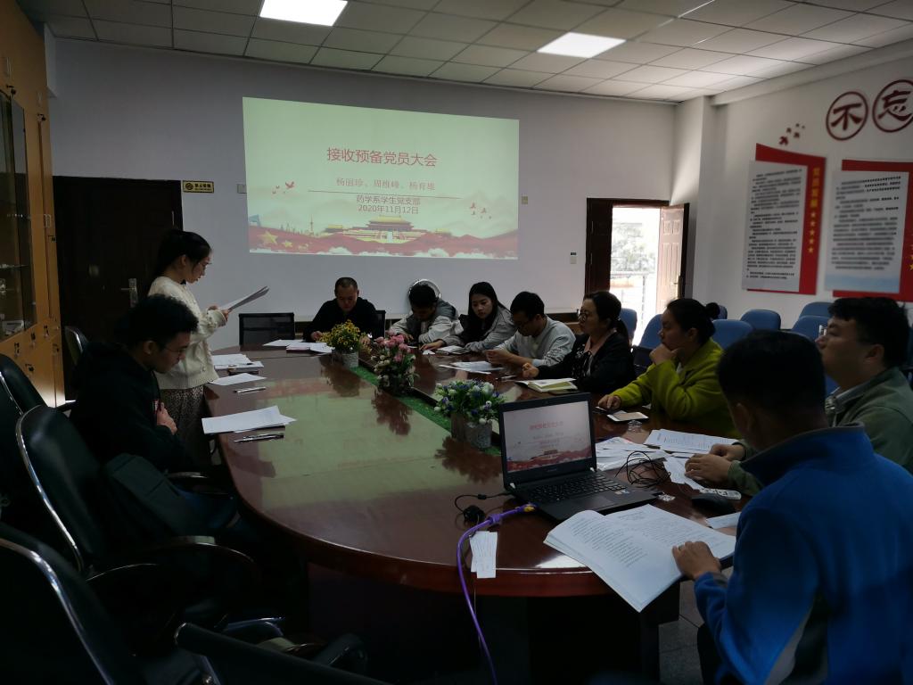 根据大会议程,会议首先听取了周维峰、杨丽珍、杨育雄等3位同志关于入党志愿、对党的认识、入党动机、自身表现、主要优缺点及需向党组织说明问题的汇报;随后,入党介绍人分别根据对3位同志的了解,对其在校表现、介绍理由及考察情况进行说明,公正表明自己意见;后经支部党员充分讨论、正式党员无记名投票,3位同志获支部大会一致认可,药学院学生党支部正式吸纳其为中共预备党员。