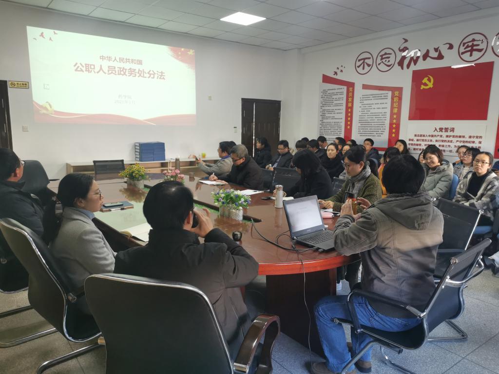 2021年1月14日,药学院组织全体教职工在会议室开展《中华人民共和国公职人员政务处分法》专题学习,会议由药学院党总支副书记赖文金主持。